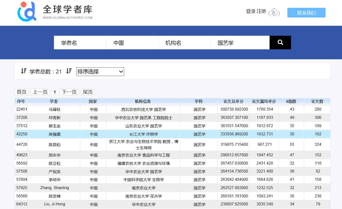 近日,国内全球学者库网站(http://www.globalauthorid.com/)公布了“全球顶尖前10万科学家排名”。公司太阳成集团tyc151吴强盛教授以论文总评分333556.9692、论文篇均评分1832.731、论文数182、H指数30,入选该项排名,位居全球42250名,在国际园艺学科排名第23位,国内园艺学科排名第4位。