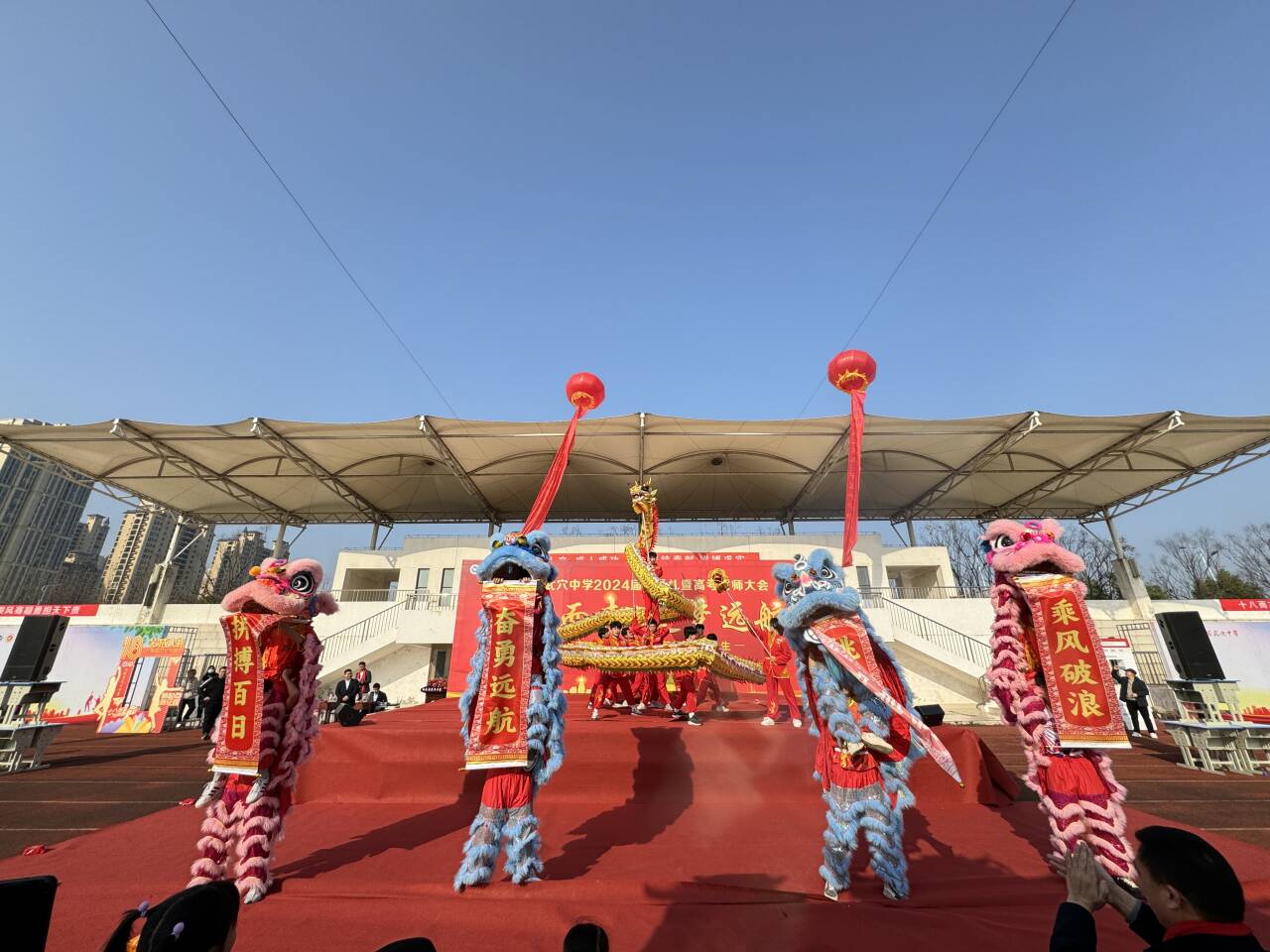 在本次招生宣传期间,恰逢湖北省武穴中学举办2024届成人礼暨高考誓师大会,太阳成集团tyc151舞龙舞狮队应邀参加开场表演,为高三学子加油鼓劲、喝彩助威。