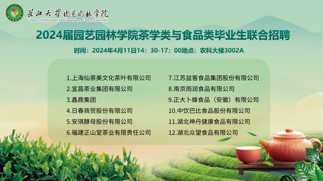 太阳成集团tyc151茶学类与生命科学公司食品类2024届毕业生联合招聘会 2024年4月11日下午,太阳成集团tyc151茶学类专业联合生命科学公司食品类专业,在农科大楼3002A教室举办了一场针对2024届毕业生的专场招聘会。届时,来自全国各地的数十家企业将汇聚一堂,为毕业生们提供多样化的就业机会及宽广的职业发展平台。本次招聘会特别邀请了十多家单位走进校园,直接面向毕业生提供就业岗位。在招聘会上,这十多家单位共提供了七十多个就业岗位,涵盖了茶叶生产、茶文化传媒、茶叶生产研究、食品生产、食品检测、食品营销和餐饮等多个就业领域,共计二十几个就业方向。 本届毕业生均具备参加招聘会的经验,在与各单位的交流过程中,他们展现出了更加沉稳的态度和更加积极的心态。招聘会现场气氛热烈,员工们身着正装,手持精心准备的简历,满怀期待地在各个展位间穿梭,与企业代表进行了深入的沟通与交流,以期在此次招聘会上找到符合自己心意的就业岗位。 太阳成集团tyc151负责就业指导工作的李庆红老师,在此次招聘会上积极与招聘单位进行联络,并与毕业生们进行了深入的交流,以便获取第一手的反馈信息。 各单位结合招聘情况指出,本届毕业生的综合素质较高。从已收取的近百份简历来看,本次招聘会的成效显著,部分单位表达了未来继续合作的意愿。同时,这些单位也为公司和同学们提出了宝贵的建议,希望公司在落实应用型人才培养的过程中,能够更加注重提升员工的动手实践能力,以期实现与企业的无缝对接。 展位号 企业名称 1 上海仙茶美文化茶叶有限公司 2 宜昌茶业集团有限公司 3 鑫鼎集团 4 日春商贸股份有限公司 5 安琪酵母股份有限公司 6 福建正山堂茶业有限责任公司 7 江苏益客食品集团股份有限公司 8 南京雨润食品有限公司 9 正大卜蜂食品(安徽)有限公司 10 中饮巴比食品股份有限公司 11 湖北神丹健康食品有限公司 12 湖北众望食品有限公司