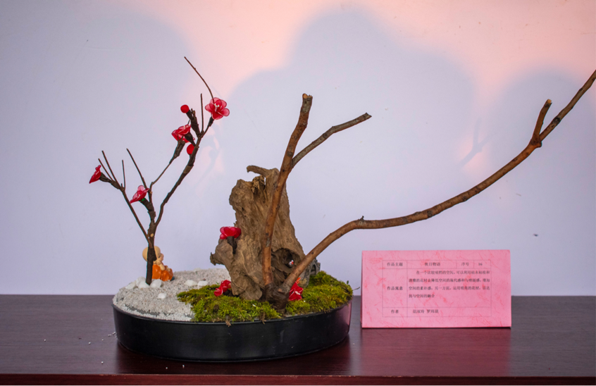 以“秋日物语”为主题的16号作品,以其独特的设计理念荣获一等奖。它利用枯木枯枝和清雅明亮的的花材,达到了与空间的和谐统一,寓意疫情过后,秋日物语,不求轰轰烈烈,只愿平安喜乐。