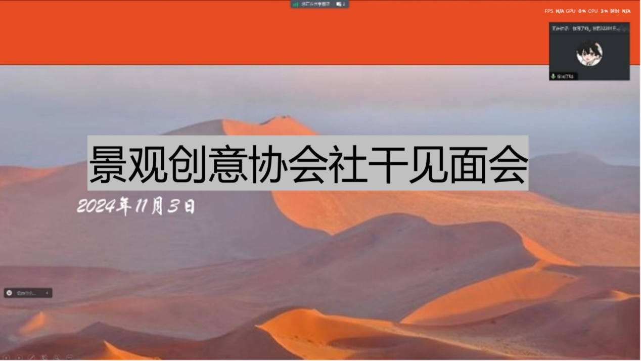 2024年11月3日晚19点,景观创意协会在腾讯会议平台成功举办了新老成员线上见面会。本次活动旨在促进新老成员之间的交流与了解,增进彼此间的友谊,并帮助新成员更好地融入社团,明确自身职责。