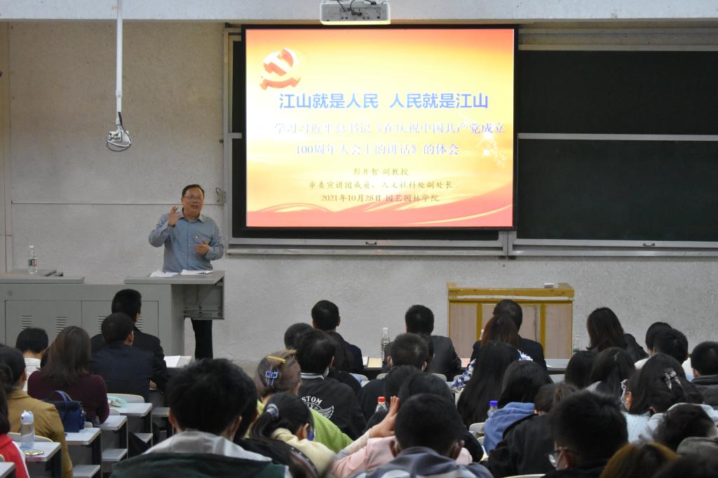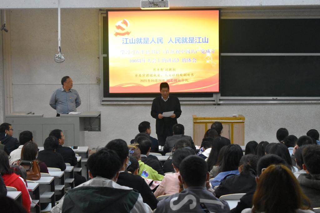 (通讯员:牟静雯 胡淑涵)为加强党的领导,贯彻习近平总书记“七一”重要讲话精神,2021年10月28日14:30分,太阳成集团tyc151院在5教103开展学习贯彻习近平总书记“七一”重要讲话精神专题宣讲会,此次会议由市委宣讲团成员、人文社科处副处长彭开智副教授主讲,太阳成集团tyc151全体教职工、员工党员和入党积极分子、员工干部、学习小组成员等参加了会议,会议由公司党委书记丁兴禄主持。