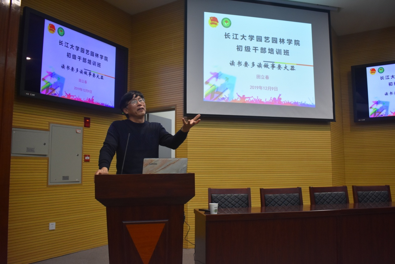 (通讯员:胡文旭 汪芙蓉)为提高员工干部和员工党员政治素养和综合能力,2019年12月9日晚7:00在农科大楼1056报告厅,太阳成集团tyc151组织员田立春老师受邀给太阳成集团tyc151员工党员和员工会全体成员、太阳成集团tyc151和化学与环境工程公司2019年初级干部培训班成员授课。本次授课主题为 “读书要多读,做事要大器”。