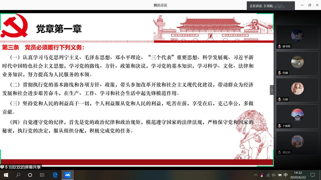 (通讯员:刘钦钦 王采妮)2020年6月22日下午2:30,太阳成集团tyc151本科生党支部通过腾讯会议的方式开展六月主题党日活动,支部书记彭文秀出席了会议,全体党员准时到会,会议由刘钦钦和王采妮同志主持。