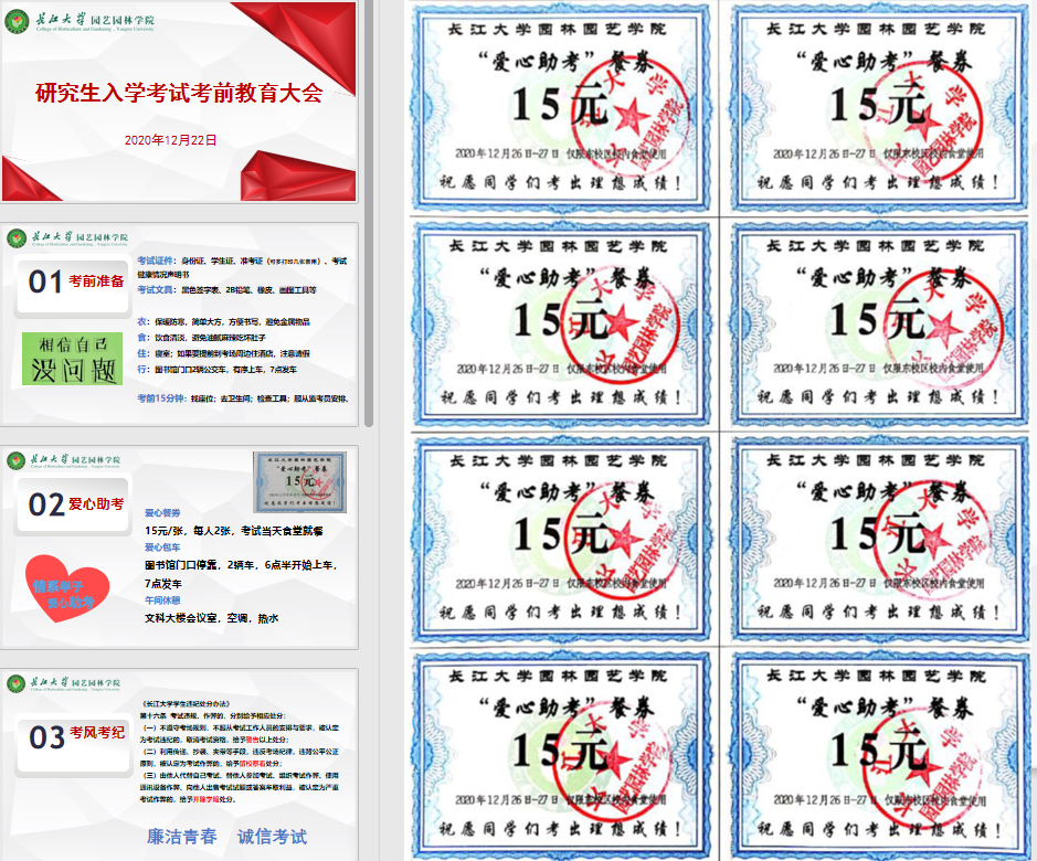 12月22日下午四点,太阳成集团tyc151在西校区农科楼1056召开研究生入学考试考前教育大会,为考研学子加油助力,送上一份不一样的温暖。毕业生辅导员黄小云围绕考前准备、爱心助考、考风考纪三方面做了具体讲解,现场发放餐券并签订了诚信应考承诺书。