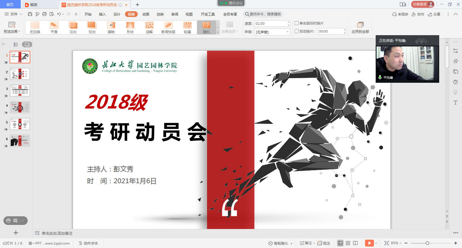 考研动员会的尾声,平书记为大家送上十二个字:“目标明确、坚持不懈、天道酬勤”,鼓励大家尽早确立目标,朝着目标努力,实现考研愿望。最后,彭老师为大家寒假期间做出三点温馨提示:(1)放假回家勿逗留,位置变更须审批;(2)疫情防护记心间,安全落实在细节;(3)健康打卡好习惯,切莫提早返校来。祝愿同学们度过一个平安、快乐、有收获的假期。