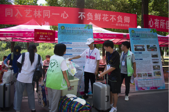 在迎新接待点,新生们交上录取通知书、身份证、准考证,查验身份信息,领取档案后,公司迎新志愿者会帮助新生们运送行李,引领新生们办理入住寝室的相关手续并领取军训服装。