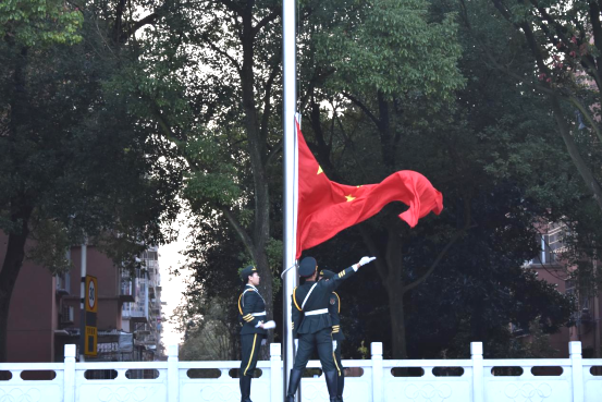 一首红歌,记录一段峥嵘岁月;一首红歌,象征一面光辉旗帜。伴随着《共筑中国梦》的千人合唱拉开了升旗仪式的序幕,用歌声表达了为国奋斗的青春誓言和决心意志。国旗班的旗手们迎着朝阳,以饱满的热情,庄严地护卫五星红旗。当雄壮有力的《义勇军进行曲》响彻了整个校园时,同学们集体行注目礼,全场弥漫着一种庄严肃穆的气息。