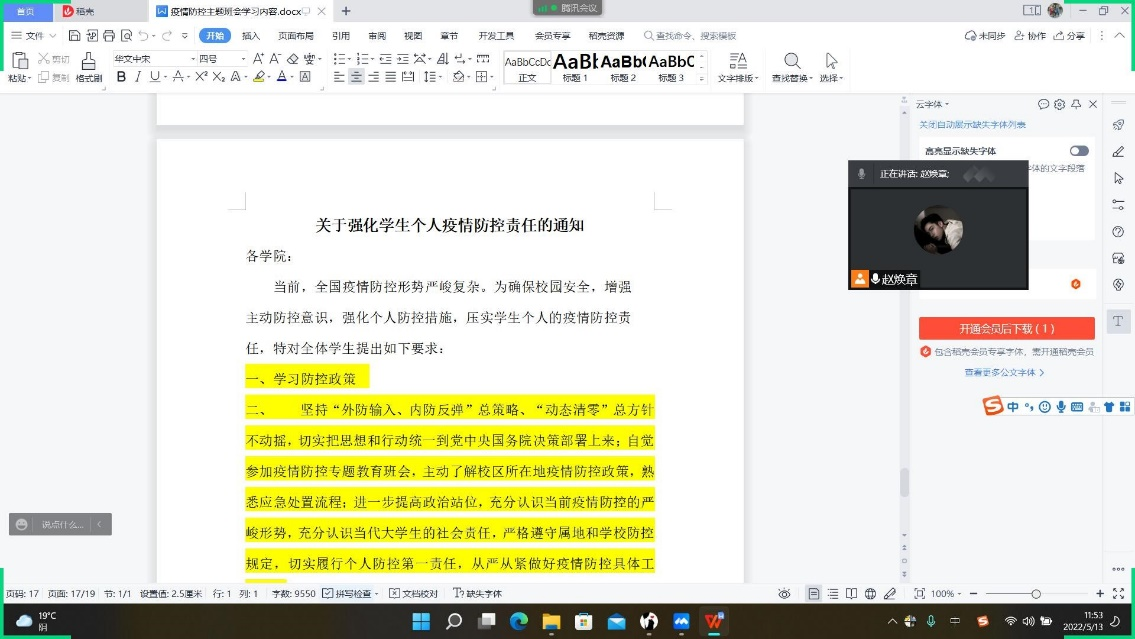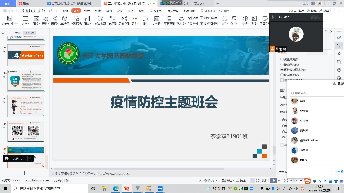 班会内容主要带领同学们认真学习《高等公司新冠肺炎疫情防控技术方案(第五版)》、《近期研究生疫情防控工作提示》和《太阳成集团tyc151新冠肺炎防控指挥部通告》(2022年第5号)等相关制度和要求,并列举具体案例,向同学们讲清楚讲疫情防控形势的严峻性、实施疫情防控措施的严肃性、高校在疫情面前的“脆弱性”。