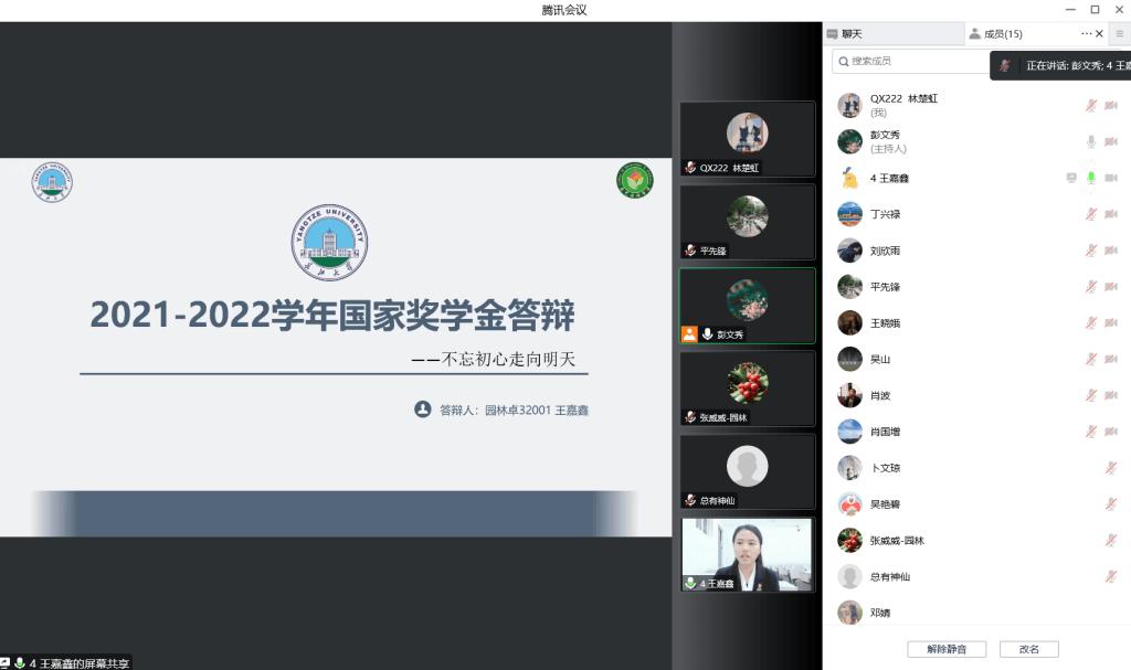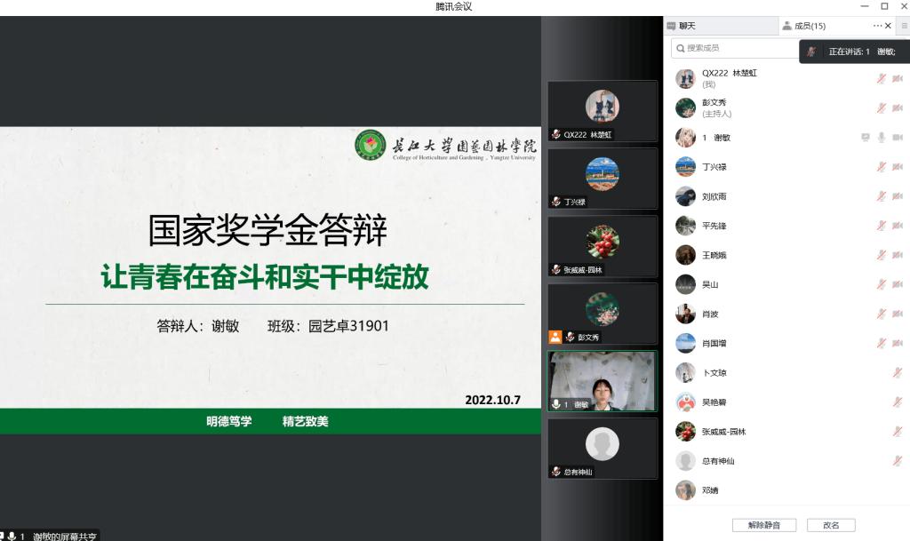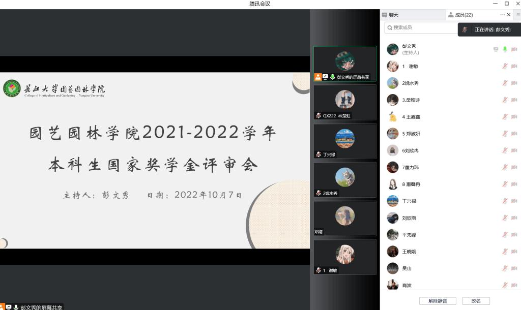 (通讯员:彭文秀)根据太阳成集团tyc151《关于开展2021-2022学年本科生国家奖学金初评工作的通知》等文件精神,2022年10月7日上午9:30,为符合疫情防控要求,公司在腾讯会议线上举行了2021-2022学年本科生国家奖学金评审答辩。公司党委书记丁兴禄老师、党委副书记平先锋老师、副经理肖波副教授、经理助理肖国增副教授、风景园林系张威威副教授、园艺系姚振老师、学籍秘书王晓娥老师、辅导员卜文琼、吴山老师和各年级员工代表等参加了此次面试评审会,会议由学工办主任彭文秀主持。