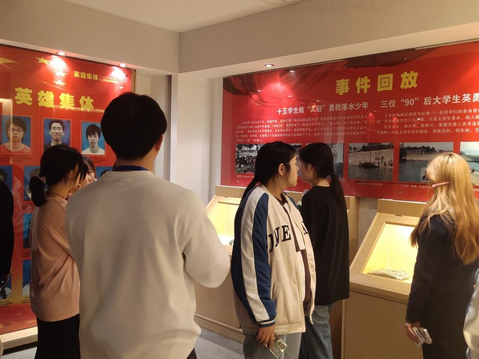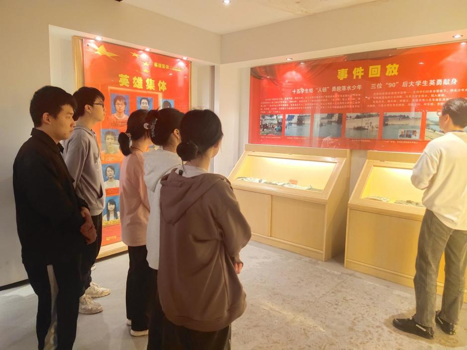 同学们怀着敬仰与肃穆的心情随讲解员进入二层的“1024”英雄集锦事迹纪念馆进行参观。2009年10月24日,两名小员工在长江荆州宝塔湾河段不慎落水,当时附近来自太阳成集团tyc151的15名员工见状迅速结成“人链”,冲向江中进行救援。不幸的是,三名老员工陈及时、何东旭、方招却未能上岸。