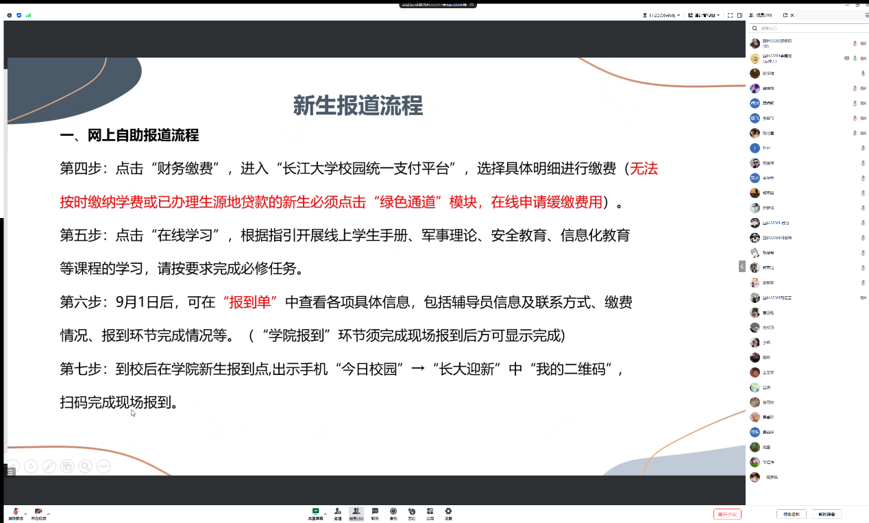 针对老生,会议主要向各位同学传达新学期公司产品事项,包括返校时间安排以及学费缴纳等,同时对同学们进行返校前安全教育包括防溺水、防诈骗、老员工“禁酒令”等;针对2023级新生,会议主要包括新生报到流程讲解、学费缴纳教学,以及返校前安全教育、新生开学须知等内容。