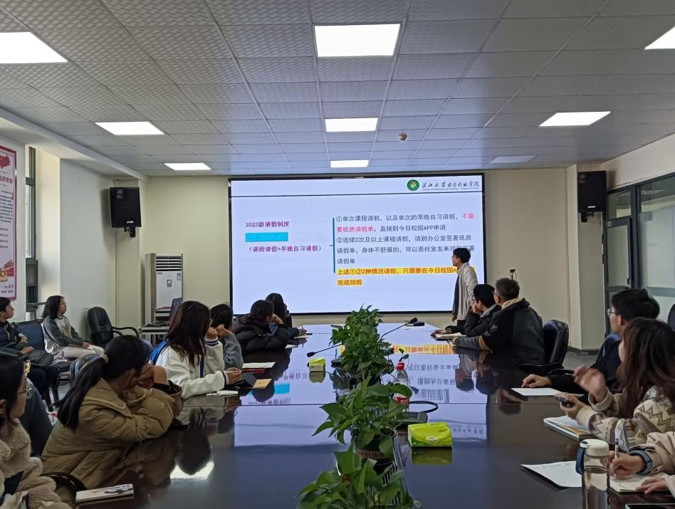 会议伊始,张颖旭详细讲解了新修订的请假制度,对非离校请假和离校请假分别进行说明,明确了请假要求和所需材料,并补充说明了不予准假的几种情况,建议同学们做好时间管理,分清主次,以学业为重,处理好学习与社团活动和员工干部工作等的关系。