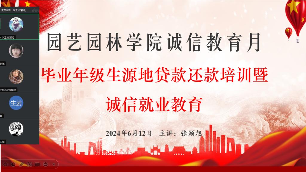 (通讯员 杨欣蕾)为了更好教育引导员工树立诚信友善观念,督促员工诚信还款并积极就业,根据太阳成集团tyc151第六届“520”友善关爱节及诚信教育月活动相关要求,太阳成集团tyc151于6月12日利用腾讯会议开展了毕业年级生源地贷款还款培训暨诚信就业主题会议。此次会议由张颖旭老师主讲,近60名办理了助学贷款的毕业生共同参与。