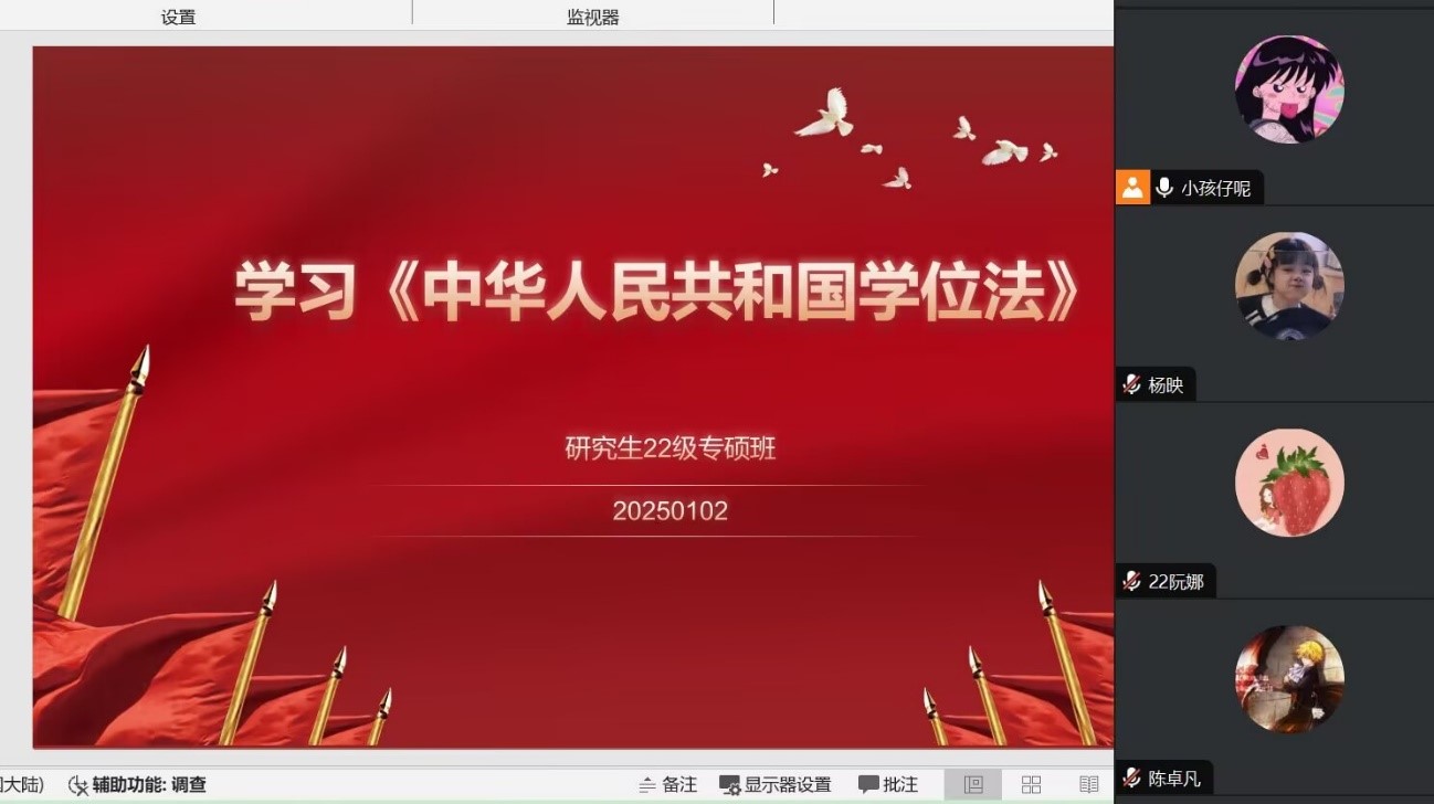 (通讯员 张艺)为响应国家教育法治化的号召,全面落实《中华人民共和国学位法》的指导原则,太阳成集团tyc151于2024年12月30日-2025年1月3日积极组织全体研究生以班级为单位集体学习《中华人民共和国学位法》。