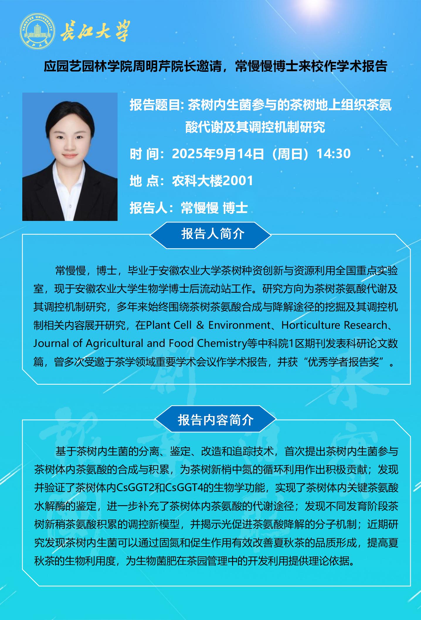 园林讲坛(2025年第十四讲):茶树内生菌参与的茶树地上组织茶氨酸代谢及其调控机制研究