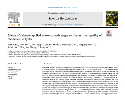 (通讯员 刘晓梦 桂嘉营)2021年6月,我中心2018级博士研究生饶申在国际权威杂志《Scientia Horticulturae》(园艺学2区,影响因子3.46)上发表了题为“Effects of selenate applied at two growth stages on the nutrient quality of Cardamine violifolia”的研究论文(图1)。饶申博士为论文第一作者,太阳成集团tyc151许锋教授为通讯作者,太阳成集团tyc151为第一署名单位。