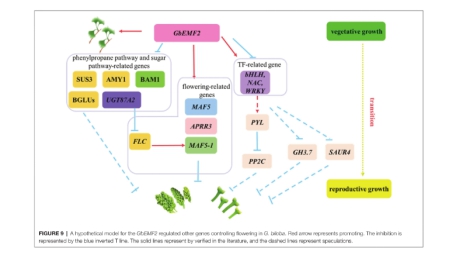 银杏具有食用、药用和观赏价值。然而,较长的童期阻碍了银杏产业的发展,而有关银杏开花时间调控基因的鉴定和功能分析的报道也很少。EMBRYONIC FLOWER 2 (EMF)是花发育过程中的重要基因,具有促进营养生长和抑制开花的作用。该研究从银杏中克隆并鉴定了一个新的基因GbEMF2。GbEMF2含有一个2193bp的开放阅读框架,编码730个氨基酸。GbEMF2含有植物EMF蛋白保守的VEFS-Box结构域。系统发育分析表明,GbEMF2起源于Pc-G蛋白的祖先,是EMF2蛋白的成员。实时定量PCR分析表明,GbEMF2在所有样品组织中均有表达,且在大孢子叶球和小孢子叶球中的表达水平显著高于其他组织。与emf2突变体相比,CaMV 35S启动子驱动的GbEMF2在emf2突变体植株中的过表达延迟了开花时间,但早于野生型植株。这一结果表明,GbEMF2抑制了银杏的开花。对转GbEMF2基因的拟南芥植株(GbEMF2-OE/emf2)、野生型植株和emf2突变体进行RNA-seq分析,筛选出227个差异表达基因。其中,FLC、MAF5和MAF5-1基因与花器官发育相关,受GbEMF2调控。此外,一些参与糖代谢的基因,如Alpha-amylase 1 (AMY1)、BAM1和Sucrose synthase 3 (Sus3)基因也受GbEMF2控制。综上所述,GbEMF2对银杏的开花具有负调控作用(图 2)。这一发现为利用基因工程技术缩短银杏童期提供了基础。
