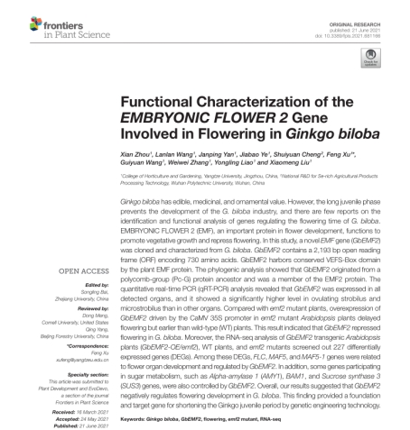 (通讯员 刘晓梦 何筱)2021年6月,我中心2020级博士研究生周仙以第一作者身份在植物学国际期刊Frontiers in Plant Science发表题为《Functional Characterization of the EMBRYONIC FLOWER 2 Gene Involved in Flowering in Ginkgo biloba》(10.3389/fpls.2021.681166)的论文(图1),通讯作者为许锋教授,太阳成集团tyc151为第一署名单位。