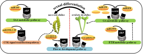 图3 miRNA调控银杏雌雄花发育与性别分化的模式图