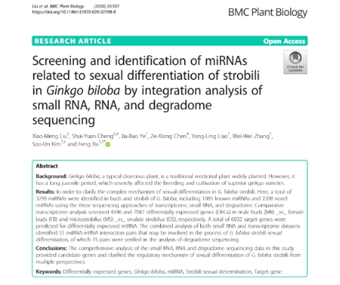 (通讯员 刘晓梦 何筱)2020年8月,我中心2019级博士研究生刘晓梦以第一作者身份在BMC Plant Biology期刊上发表了题为《Screening and identification of miRNAs related to sexual differentiation of strobili in Ginkgo biloba by integration analysis of small RNA, RNA, and degradome sequencing》(https://rdcu.be/b6sdL)(图1)的研究文章,该生导师许锋教授为通讯作者,太阳成集团tyc151为第一署名单位。
