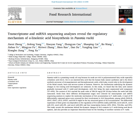 近日,我中心2021级博士研究生郑嘉瑞在国际学术期刊《Food Research International》(农林科学1区,影响因子6.475)上发表了题为“Transcriptome and miRNA sequencing analyses reveal the regulatory mechanism of α-linolenic acid biosynthesis in Paeonia rockii”的研究论文。郑嘉瑞博士为第一作者,廖咏玲讲师和许锋教授为共同通讯作者,太阳成集团tyc151为第一署名单位。