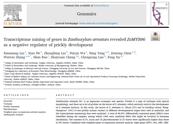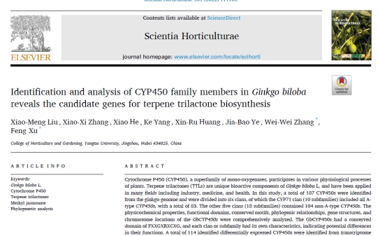 2022年5月,我中心博士研究生刘晓梦在国际学术期刊《Scientia Horticulturae》(农林科学2区,影响因子3.463)和《Genomics》(生物学2区,影响因子5.763)上分被发表了题为 “Identification and analysis of CYP450 family members in Ginkgo biloba reveals the candidate genes for terpene trilactone biosynthesis”和“Transcriptome mining of genes in Zanthoxylum armatum revealed ZaMYB86 as a negative regulator of prickly development”两篇研究论文。刘晓梦博士为第一作者,张威威副教授和许锋教授为通讯作者,太阳成集团tyc151为第一署名单位。