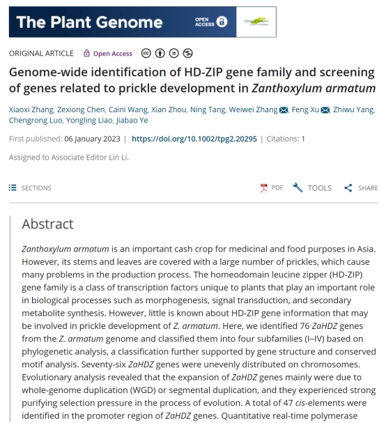 2023年1月,我中心硕士研究生张晓熙在国际学术期刊《The Plant Genome》(植物科学2区,IF:4.219)上发表题为“Genome-wide identification of HD-ZIP gene family and screening of genes related to prickle development in Zanthoxylum armatum”的研究论文。张晓熙为第一作者,张威威副教授和许锋教授为通讯作者,太阳成集团tyc151为第一署名单位。