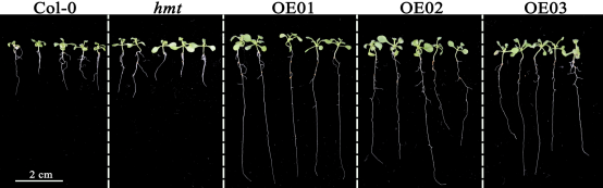 图4 转BpHMT2基因、野生型和突变体拟南芥在硒酸钠平板的生长情况
