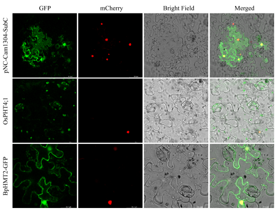 分别构建了烟草瞬时表达载体,鉴定了BpHMT2发挥功能的细胞器(图3);构建基因过表达载体,获得3个转基因拟南芥株系,并比较了不同株系在硒酸钠处理下的生长情况(图4),证明BpHMT2具有提高植物耐硒能力的生物功能。