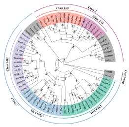 本研究基于前期研究结果,对构树主要成分硒代蛋氨酸合成基因HMT进行了挖掘。成功筛选出3个BpHMT家族基因,构建了27个物种构成的HMT蛋白进化树,显示BpHMT2归类于Class 2-D家族(图2),并可能具有更基础的催化功能。