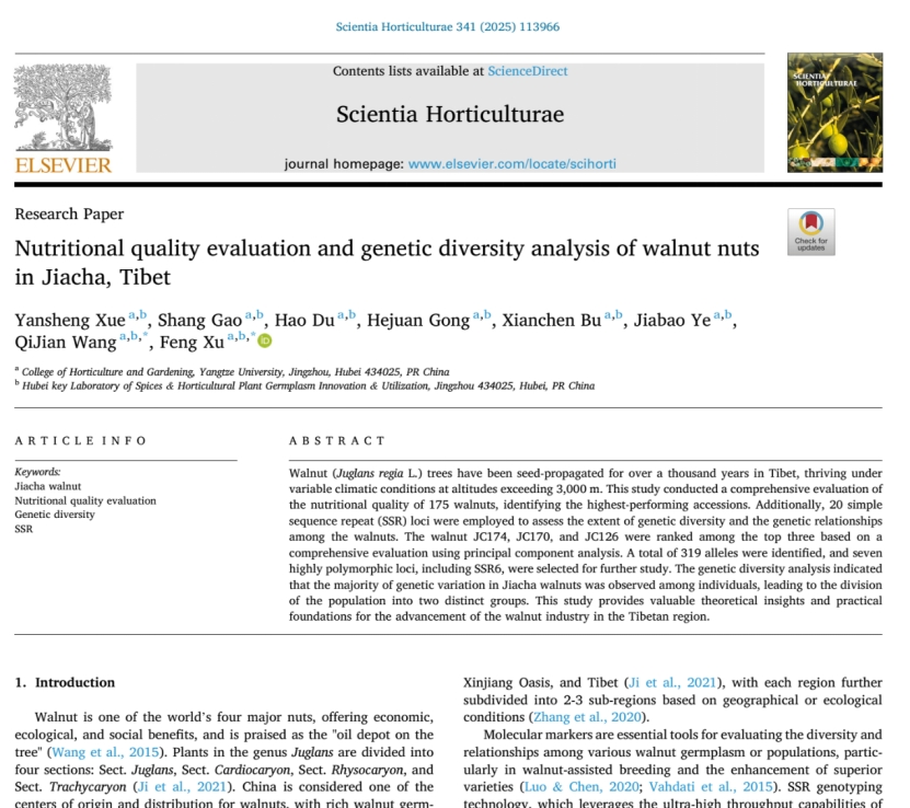 近日,长大植物硒学团队科研助理薛岩晟在国际学术期刊《Scientia Horticulturae》(农科科学2区Top,IF:3.9)上发表题为“Nutritional quality evaluation and genetic diversity analysis of walnut nuts in Jiacha, Tibet”的研究论文。太阳成集团tyc151王启剑副教授和许锋教授为通讯作者,太阳成集团tyc151为第一署名单位。
