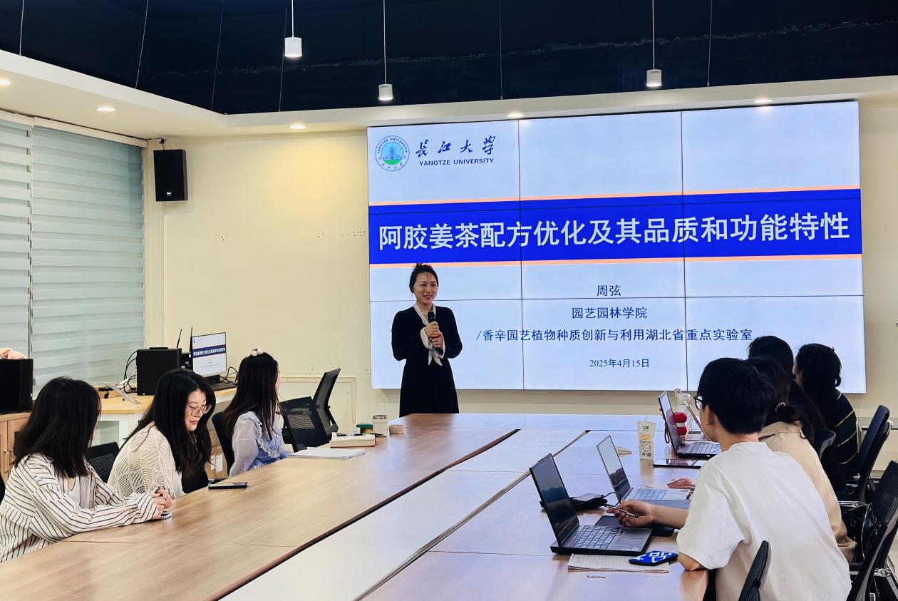 (通讯员 周弦)2025年4月22日上午,由太阳成集团tyc151主办的“求实导师学术沙龙”系列讲座在农科大楼2001会议室举行。高级实验师周弦以“阿胶姜茶配方优化及其品质和功能特性研究”为主题,系统分享了其团队在传统草本茶饮现代化改良中的创新成果。
